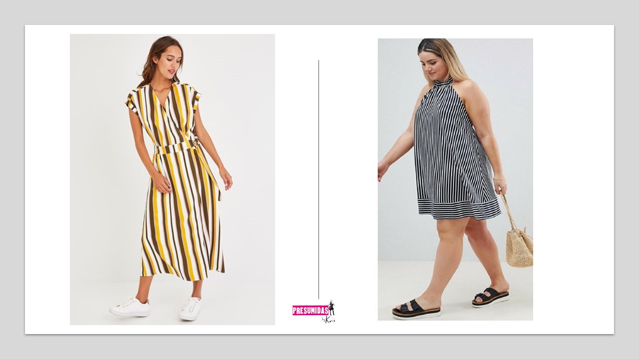 Los vestidos de rayas verticales estilizan y te veras más esbelta. Si eres estrecha en la parte de arriba y más ancha en la parte de abajo entonces puedes jugar con las rayas horizontales y verticales.