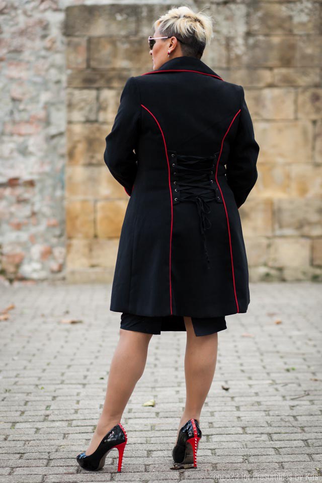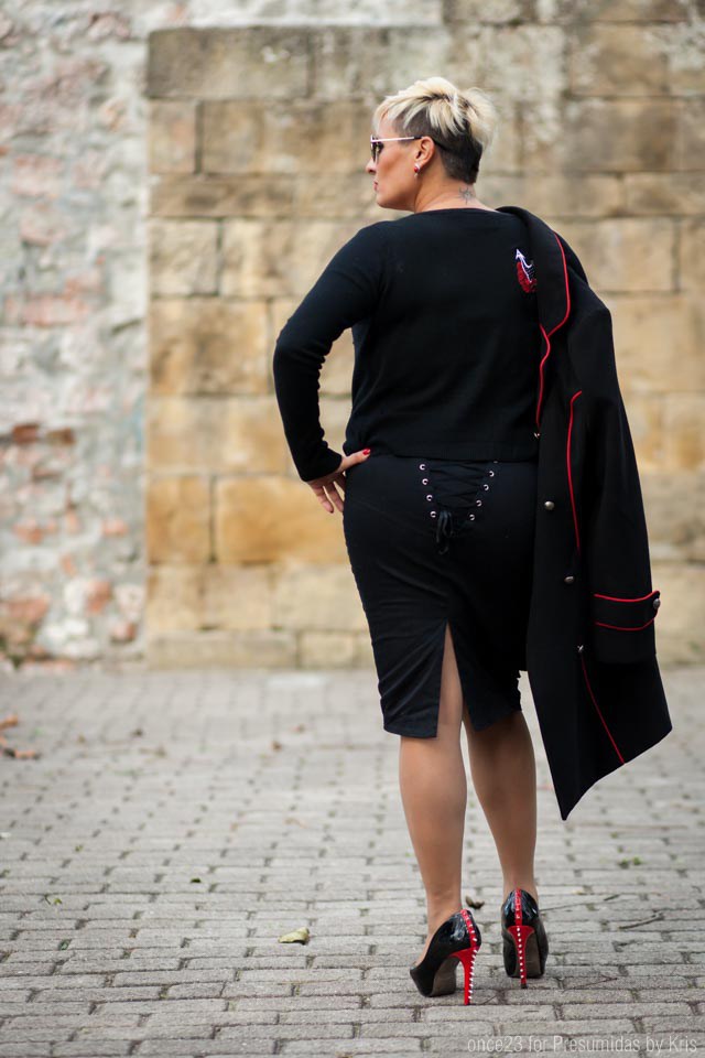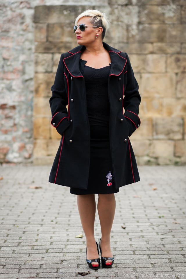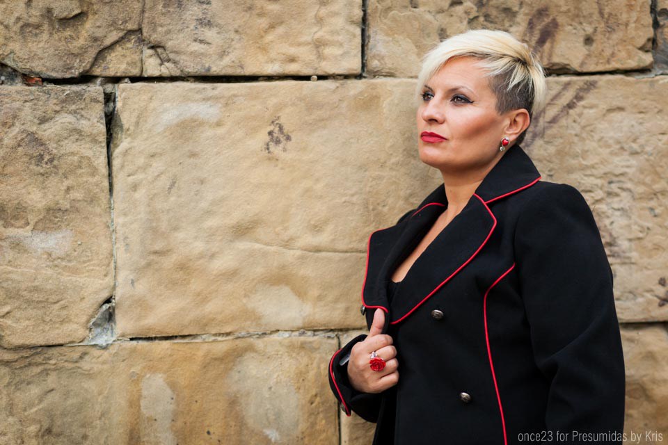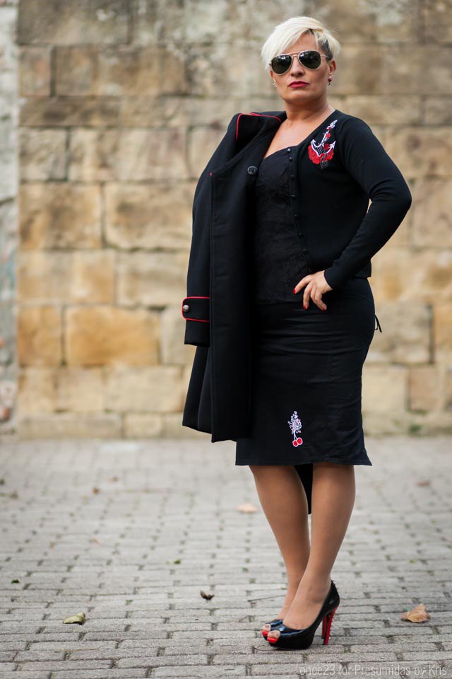 En estas primeras imágenes llevo abrigo pin up negro de paño con ribete en rojo, atado en la zona de la espalda. Yo lo he combinado con falda lápiz y chaqueta negra para completar el look con un aire pin up como el abrigo.