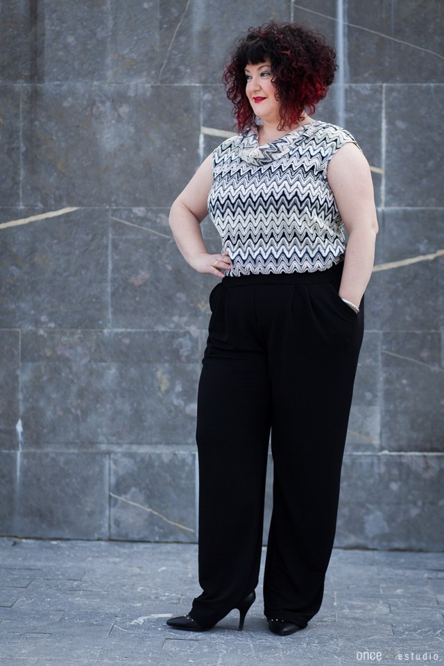 En este primer look Olatz nos muestra un mono con dos combinaciones, cuerpo con estampado art y en la parte de abajo negro con mucha caída para evitar que nos marque. Un look para una ocasión especial. Una buena elección para comuniones o bodas.