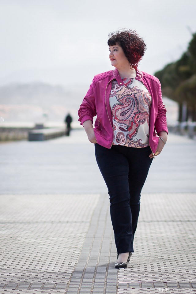 Un look casual pero no menos estiloso. Pantalón azul marino con camiseta estampado art y cazadora de Polipiel rosa aportándole al outfit color.
